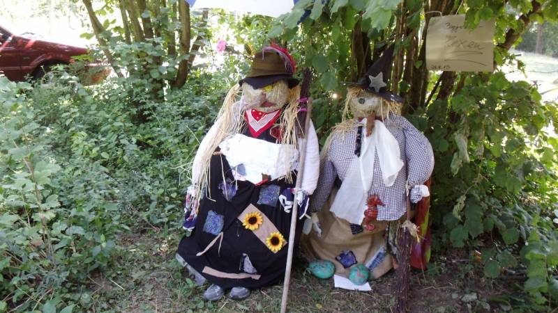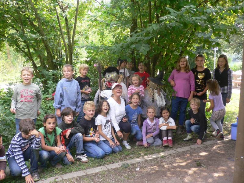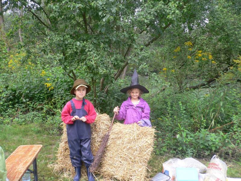 Zahlreiche Kinder halfen mit das Hexenpärchen zu gestalten. Der Korpus der Hexen war aus Stroh und Heu gefertigt und durch einen Holzstab stabilisiert.