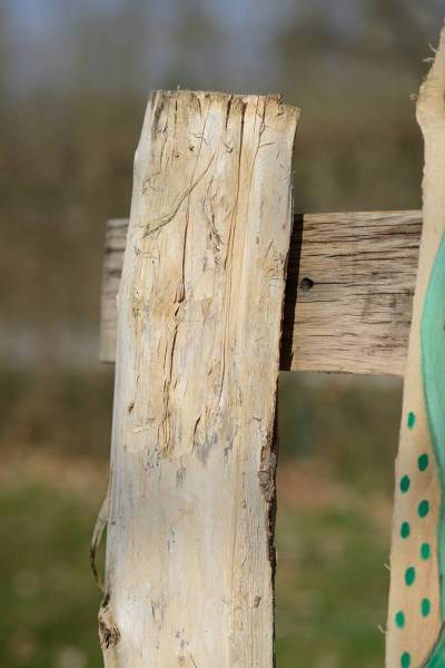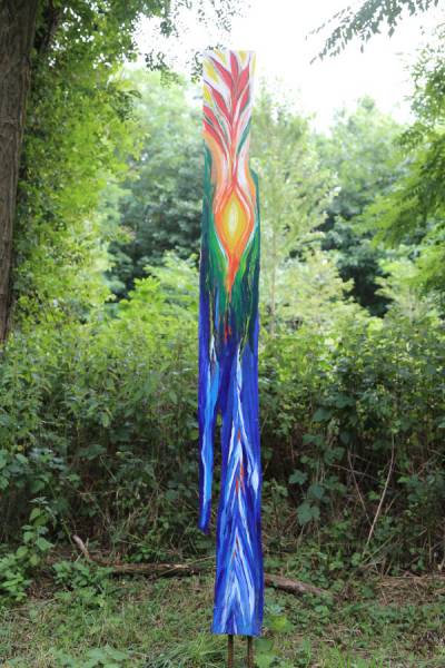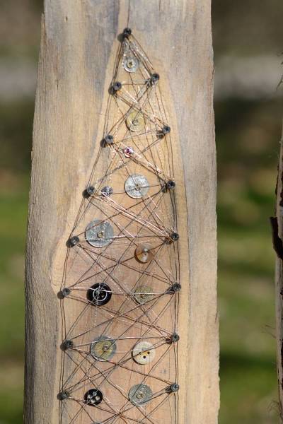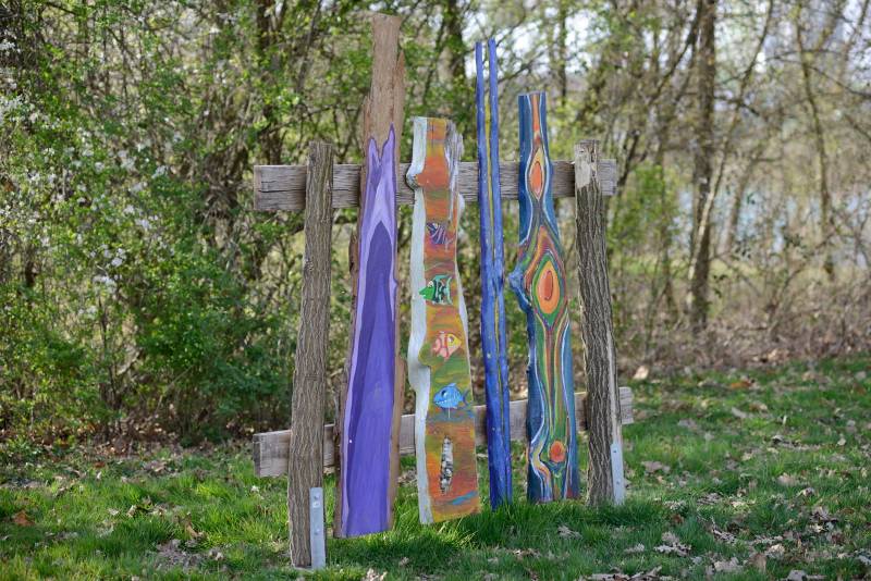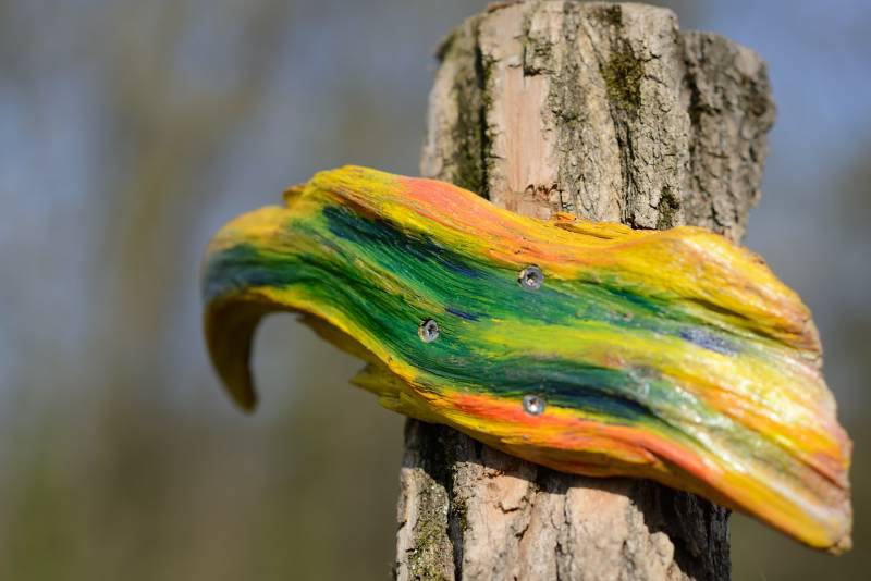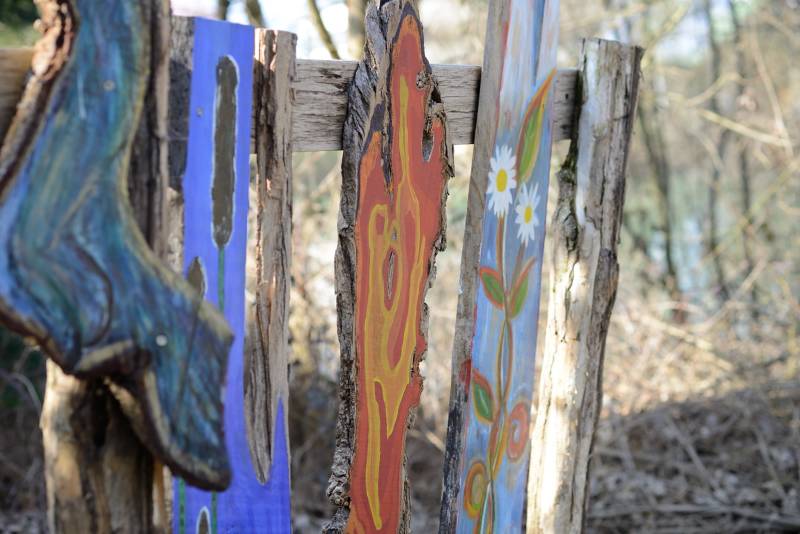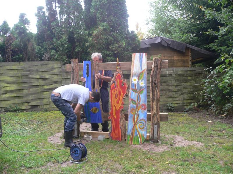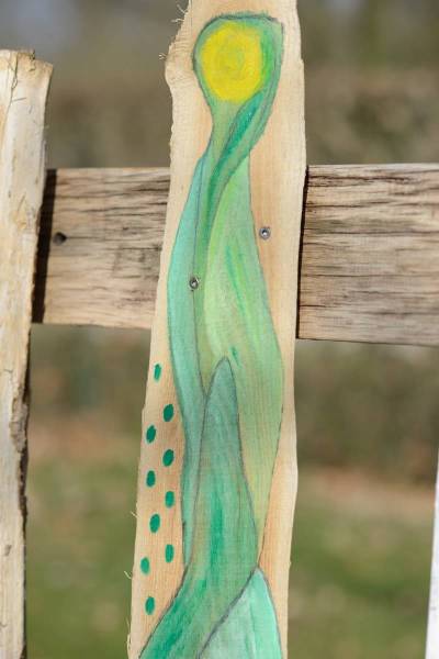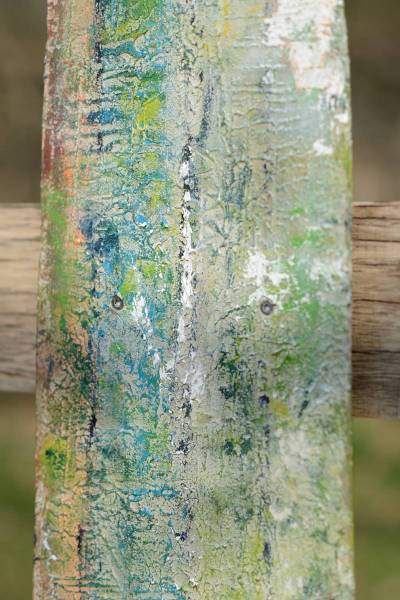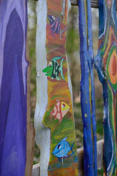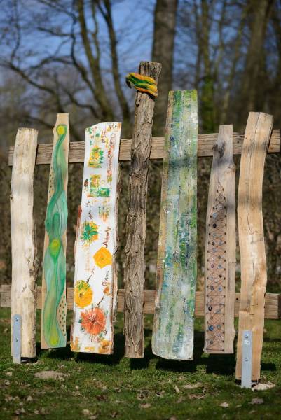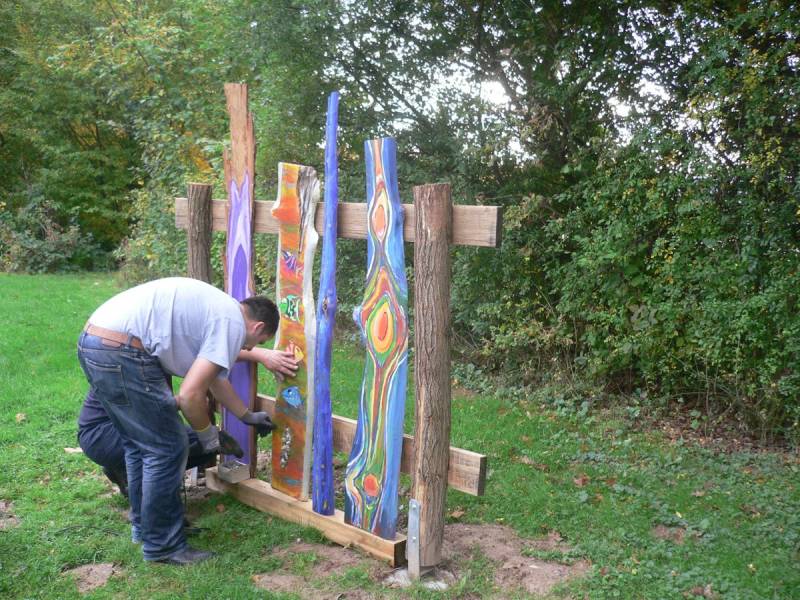 Die Schwartenbretter wurden mit hauptsächlich Arcylfarben, teilweise auch mit Ölfarben bemalt. Auch wurde das Werk von Silvia Schreiber mit Drähten und Knöpfen kreativ gestaltet. Der Zaun besteht aus Akazienpfählen und Eichenbretter, worauf die ausgesuchten Werke geschraubt wurden.